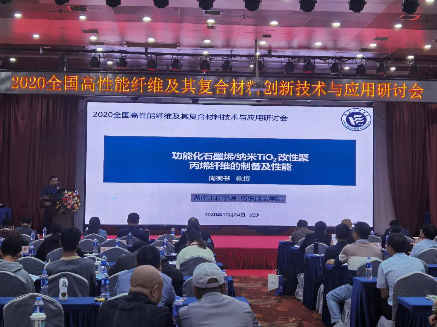 10月23-25日,“全国高性能纤维及其复合材料创新技术与应用研讨会”在湖南长沙召开,本次会议的主办方由中国欧洲经济技术合作协会新材料产业促进会、全国特种合成纤维信息中心和有关赞助企业联合主办,并得到协办单位的大力支持。本次会议就“十三五”高性能纤维及其复合材料取得的重要成果及“十四五”规划的设想与建议的报告,并由全国特种合成纤维中心介绍国内外高性能纤维及其复材最新创新信息和发展近况,邀请知名专家学者作综合性报告以及科研第一线的中青年科技人员介绍他们的创新成果,通过深度交流,促进本行业的共同发展,同时为有关部门制定和完善“十四五”规划提供依据。伟德betvlctor1946源于英国周衡书教授作为会议特邀嘉宾作了《功能化石墨烯/纳米TiO2改性聚丙烯纤维的制备工艺及其性能》主题报告。