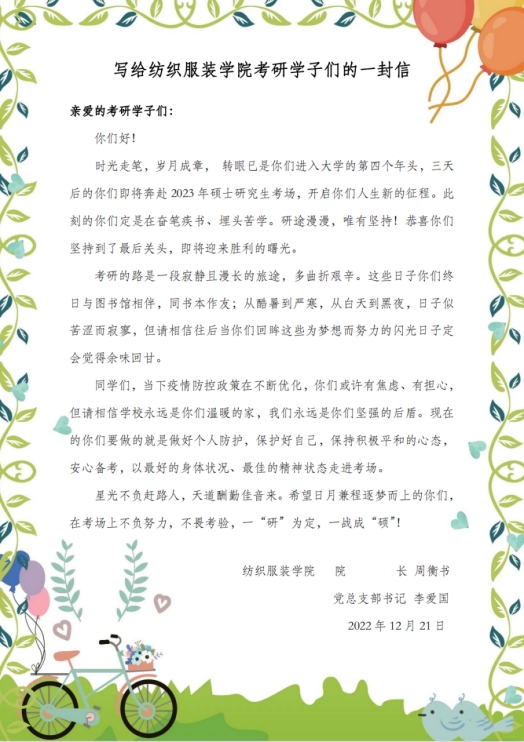 学院主要领导代表全院教职工深情寄语考研学子,叮嘱学生做好个人防护,劳逸结合,做好考前准备、消除焦虑、缓解紧张的情绪,拿出必胜的决心和勇气,最佳的精神状态走进考场。