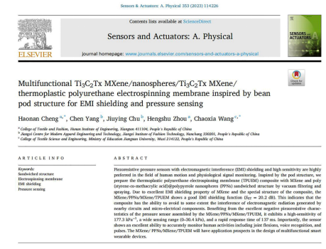 近日,纺织工程教研室程浩南老师在多功能纳米纺织材料研究领域取得新进展,研究成果以“Multifunctional Ti3C2Tx MXene/nanospheres/Ti3C2Tx MXene/ thermoplastic polyurethane electrospinning membrane inspired by bean pod structure for EMI shielding and pressure sensing”为题发表在国际期刊《Sensors and Actuators: A. Physical》上(DOI: 10.1016/j.sna.2023.114226),该期刊为SCI收录期刊(2022年影响因子4.291),是Elsevier旗下一本专注于传感器前沿研究的期刊。程浩南老师为该论文第一作者和共同通讯作者,伟德国际victor1946为第一单位和通讯单位。