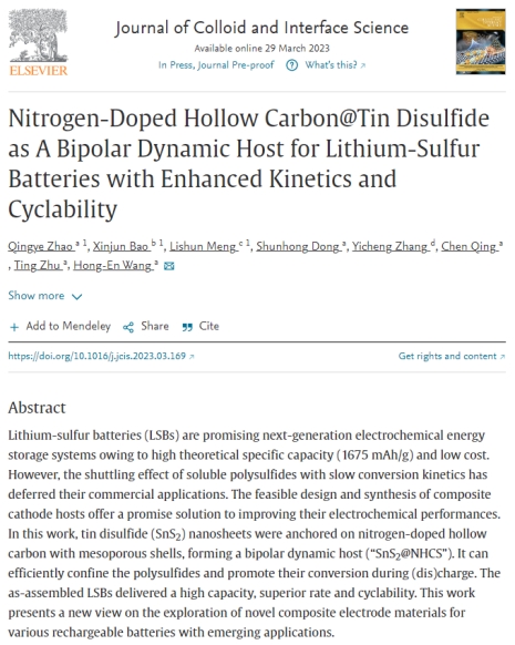 近日,纺织工程教研室包新军博士与云南师范大学王洪恩教授合作,在能源材料领域取得新进展,研究成果以“Nitrogen Doped Hollow Carbon@Tin Disulfide as A Bipolar Dynamic Host for Lithium-Sulfur Batteries with EnhancedKinetics and Cyclability”为题发表在国际期刊《Journal of Colloid and Interface Science》上(DOI:10.1016/j.jcis.2023.03.169)(JCRQ1,中科院SCI一区Top期刊,IF=9.965)。包新军博士为该论文共同第一作者,伟德国际victor1946为第二完成单位,云南师范大学王洪恩教授为论文通讯作者,云南师范大学为论文第一完成单位。