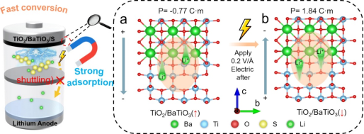 在这项工作中,提出了一种新型空心纳米复合材料,即TiO2/BaTiO3异质结构,并用超薄碳层进行修饰。该材料作为一种双向电催化剂,可以有效提升多硫化锂的吸附和硫的氧化还原动力学,从而提高锂硫电池的性能。该材料的优势在于:(1)自发形成的电场:TiO2/BaTiO3异质结构的界面会形成电场,引导多硫化锂的迁移,促进其氧化还原反应。(2)铁电材料的极化效应:BaTiO3的铁电特性可以增强对多硫化锂的吸附,减少穿梭效应,提高电池性能。(3)双向催化功能:TiO2和BaTiO3分别对硫的不同氧化态进行催化,实现硫的逐步转化。 实验结果表明,该复合材料电极在1 C倍率下展现出836 mAh·g−1的高初始容量,经过400次循环后仍保持64%的容量,衰减率仅为0.075%。即使在6.02 mg·cm−2的高硫负载和6.5 μL·mg−1的电解液/硫比下,该电池也展现出优异的倍率性能和循环稳定性。