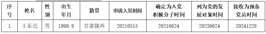 根据《中国共产党章程》《中国共产党发展党员工作细则》及《中共伟德国际victor1946委员会发展党员工作实施细则》的规定,经本人申请、党支部征求意见、支部委员会审查并报学院党委审查,拟将王东亮同志转为正式党员。现将有关情况公示如下:
