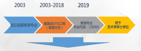 我校于2003年成立首届服装表演专业,在2003年——2018年这期间服装表演隶属于服装设计与工程下的一个专业方向,于2018年申报表演专业,2019年正式获批表演专业招生。
