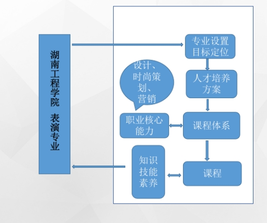 表演专业毕业生核心职业能力:表演基础、时尚策划、营销。以学生核心职业能力培养为中心,在理论课程设置上,通识基础教育课程、学科基础课程、专业课程、创新创业能力课程;在知识模块上,包含能力素质、设计能力、时尚审美与策划能力、营销能力课程。按照内容由简单到复杂,能力由弱到强的思路,实践教学循序渐进,将实践能力培养划分为“基本技能层”、“综合应用能力与初步设计能力层”和“实践与创新能力层”三个层次。
