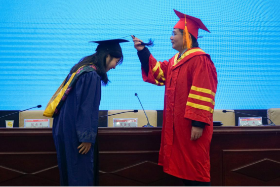 学位授予仪式上,易兵为获得硕士学位的研究生施拨穗礼,授予学位证书、毕业证书,并亲切地与每一名研究生合影留念。