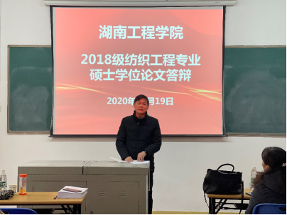 本学位点23名研究生分为2组,分别在电教201和303室进行学位论文答辩。答辩委员会主席由武汉大学的万晓霞教授(教学指导委员会专家)和西安工程大学的万明教授担任,成员有易兵校长、刘洞波院长、周衡书副院长、潘立军副院长、湘潭大学的朱建教授、湖南师范大学的伍魏博士、企业专家吴少新高级工程师及蒋敏高级工程师。19日上午八点,答辩委员会主席致词并宣读答辩程序。