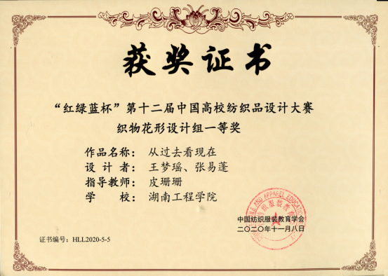 2020年11月7日,由中国纺织服装教育学会主办的“红绿蓝杯”第十二届中国高校纺织品设计大赛作品评审会在绍兴文理学院河西校区举行。我校伟德betvlctor1946源于英国学子喜获佳绩,一等奖两项,二等奖四项,三等奖九项。其中,王梦瑶、张易蓬同学的作品《从过去看现在》(指导老师:皮珊珊)和黄仕卿、熊紫吟、李娜同学的作品《微*不微》(指导老师:周琪)荣获一等奖。