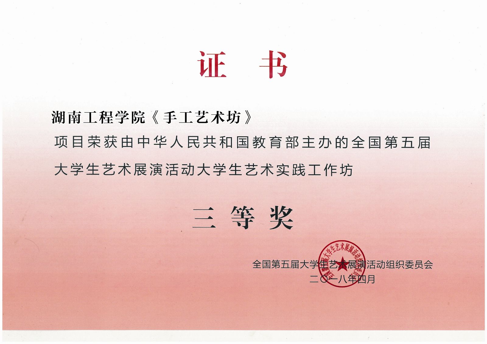 近日,从湖南省教育厅传来消息,我校校团委选送的项目《手工艺术坊》荣获全国第五届大学生艺术展演活动大学生艺术实践工作坊三等奖。