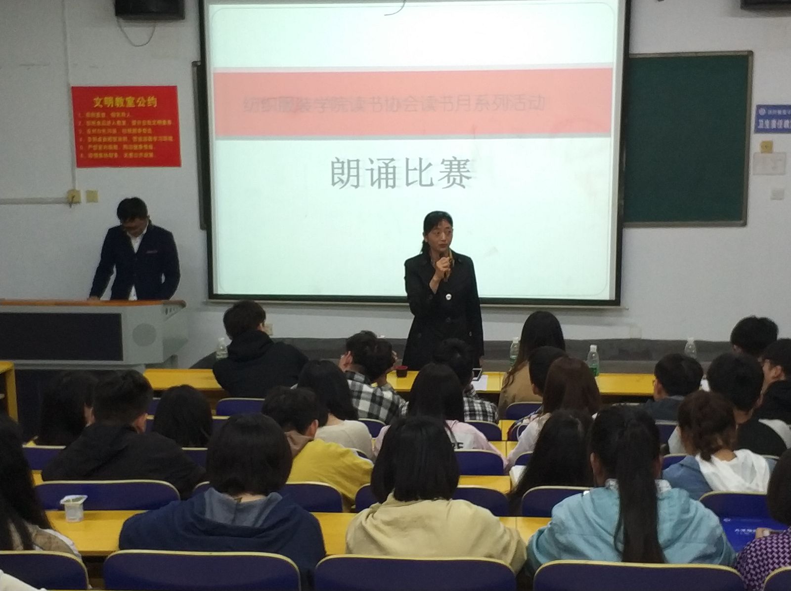 伴随着最后一位选手朗诵的结束,活动宣布了读书月征文比赛的获奖者以及朗诵比赛的获奖情况。其中,于丹阳获得征文比赛一等奖,熊佳丽获朗诵比赛优秀个人,纺工1704班获本次活动“优秀组织奖”。最后,各评委为获奖者颁奖。