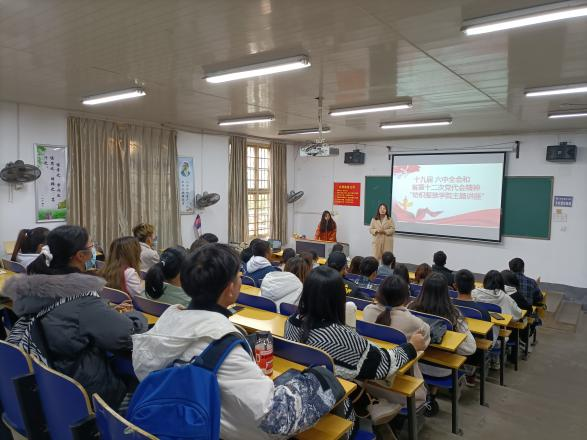 在同学们热烈的掌声中,讲座正式开始首先,喻亦荣老师为大家讲述了党的十九届六中全会和省第十二次党代会的重大意义和核心要义。告诉大家要牢固树立政治思想、大局意识,要主动向党中央看齐,向党的理论和理论方针政策看齐,做到党中央提倡的坚决响应,党中央决定的坚决执行,党中央禁止的坚决不做。