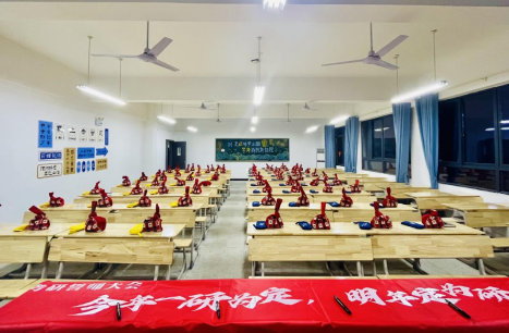 在誓师大会开始前,学院精心为考研学子准备了一份满载祝福与关怀的“考研大礼包”—“包”你上岸的针织福袋;捷足先登的祝福袜;一战“橙”硕的橙子;印有纺织新大楼的祝福明信片;柿柿如意的钥匙扣;驱散寒冷的暖宝宝。入场时,考研学子们在布置温馨的会场前排横幅上,签下自己的名字,签下对一战成硕的坚定信念和对考研艰难一路的自我肯定。
