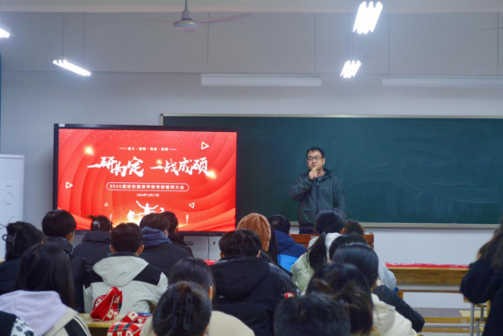 何斌作考研动员讲话,他鼓励同学们一要坚定信念、坚持到底,就如何安排好冲刺阶段的学习和生活提出了三点建议:一是要坚定信心,相信自己的每一次进步,都会助力自己摘取成功的果实;二是要沉着冷静,克服焦虑心理,以从容的心态面对考试;三是要劳逸结合,保证有规律的作息和充足的睡眠。他表示学院高度重视考研工作,将竭尽全力为考研学生提供多渠道、多层次、全方位的帮助与支持,为2025届毕业生顺利实现考研目标保驾护航。