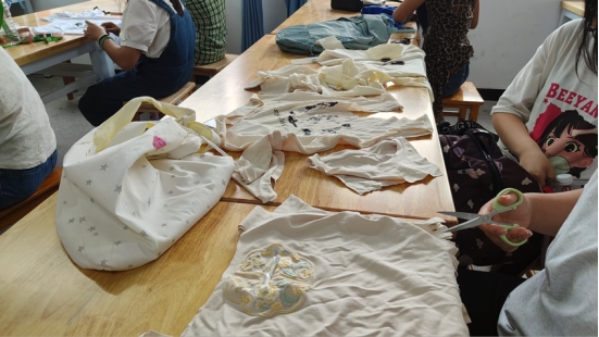 下午14:00,40位“校园设计师”摩拳擦掌,拿起剪刀、针线,开始了一场与时间的赛跑。T恤“咔嚓”几刀变身潮流托特包、外套改造成了酷炫的收纳袋——果然,纺织学院的同学们都是“隐藏的裁缝大神”!活动现场笑声不断,偶尔传来“哎呀,缝反了!”的可爱惊呼,但很快又被创意满满的补救方案化解。学院提供的丙烯马克笔和补丁贴成了“点睛之笔”,让每件作品都独一无二。