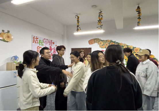 活动在热身游戏“大风吹”中拉开序幕。现场笑声不断,紧张感瞬间消散。随后15名同学随机分成3组,通过“滚雪球”和“松鼠与大树”游戏,迅速打破陌生感。在“松鼠与大树”环节中,同学们扮演不同角色,在指令变换中灵活协作,不仅增进了彼此了解,更感受到了团队协作的乐趣。“刚开始还有点拘谨,但游戏让大家很快放松下来,就像老朋友一样。”服设2502班于致帅分享道,“这种互动方式比单纯自我介绍有趣多了,我现在能记住组里每个人的名字和特点。”