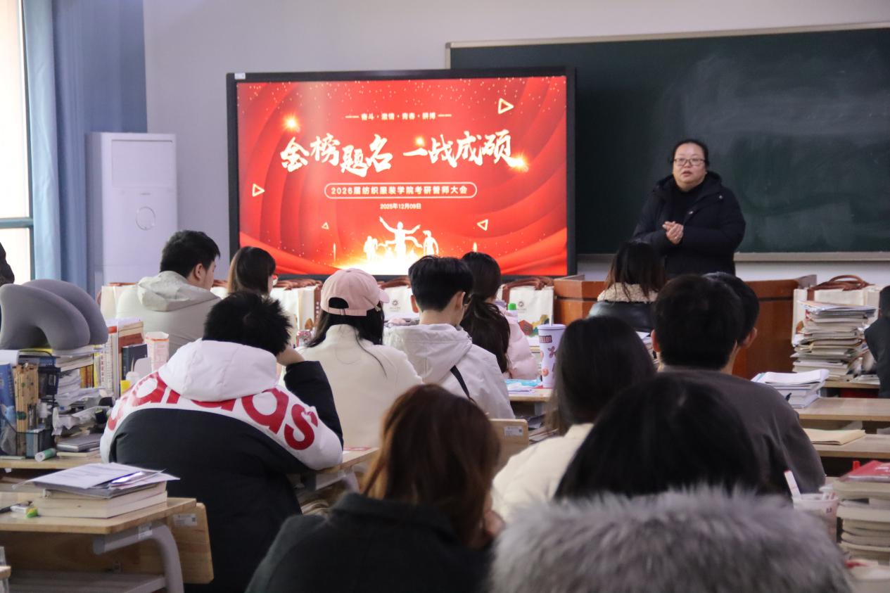 赵玲令副书记在讲话中代表学院向全体考研学子表达了亲切的问候与全力支持。她鼓励同学们在最后的备考时期保持专注、调整心态、树立信心,将个人理想融入时代发展,并郑重表示学院始终是同学们坚强的后盾,将持续做好各项保障与服务,为大家安心备考、实现梦想保驾护航。