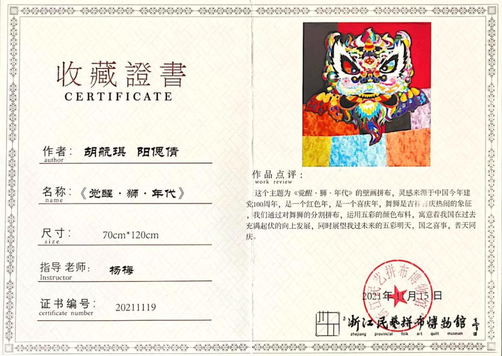 《觉醒·狮·年代》浙江民艺拼布博物馆收藏证书