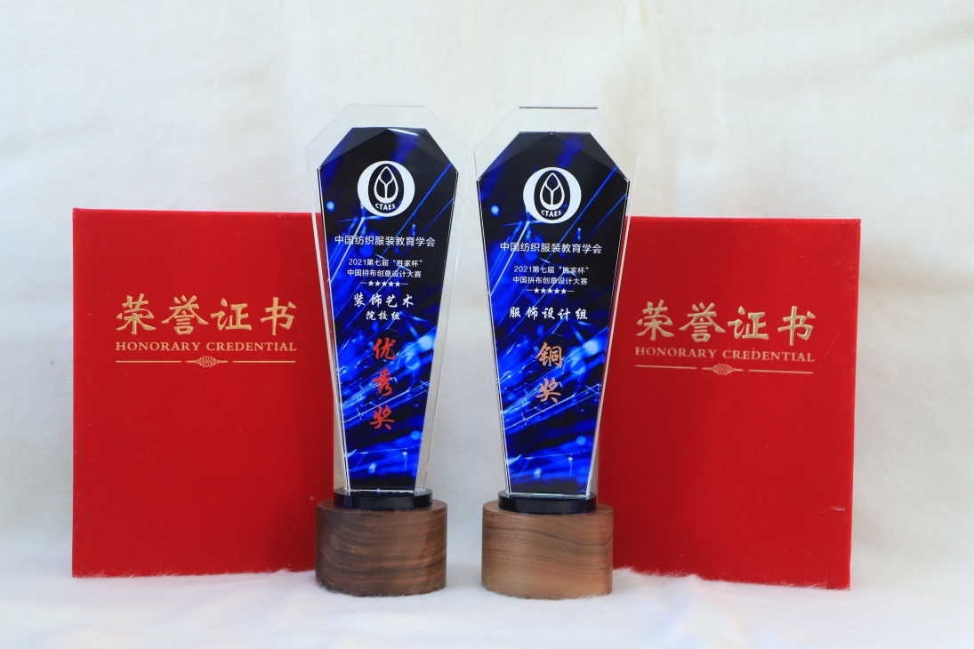 我院这次共选送10套作品参加了本次大赛。其中2018级服装与服饰设计专业丁晓凡张镨文 孙靓 孙鹏的作品《边城》(指导老师:杨梅)获得服饰艺术组铜奖;刘姿巧、段梓璇、路彩霞、丁晓凡、孙靓、张谱文的作品《榜样力量奥运健儿之系列》(指导老师:杨梅)获得装饰艺术组优秀奖。其中《榜样力量奥运健儿之系列》和《觉醒·狮·年代》两幅作品还被浙江民艺拼布博物馆收藏。
