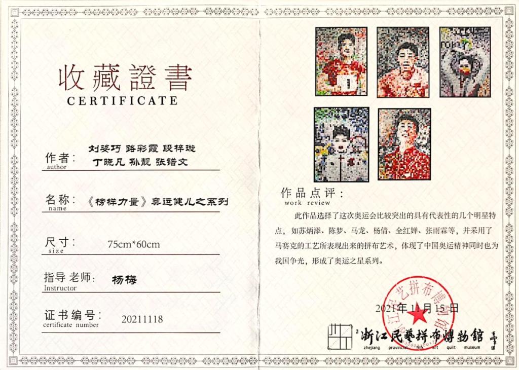 《榜样力量奥运健儿之系列》浙江民艺拼布博物馆收藏证书》