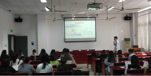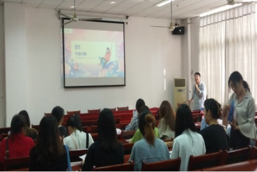 图为学而思集团主讲人为我校大学生介绍公司背景等内容