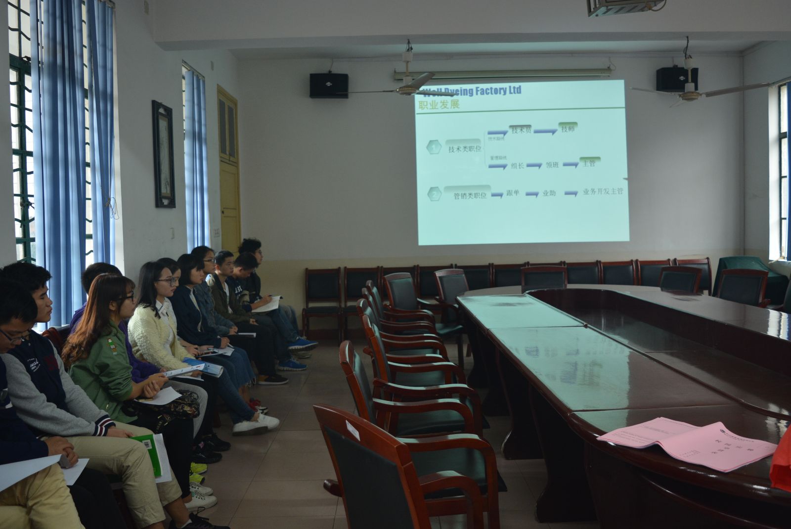 2016年10月13日上午10:00,中山国泰染整有限公司在电教105召开招聘宣讲大会,参与此次会议的有中山国泰企业人力资源部负责人、我系纺织工程专业13级部分应届毕业生以及化学化工学院毕业生。