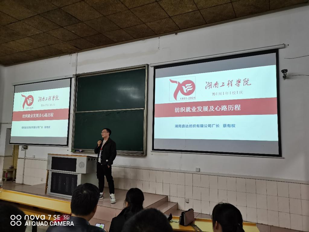 广州无竞贸易有限公司董事长严果丰校友给大家做了题为“纺织就业发展及心路历程” 的主题分享。严学长是棉纺工程94211班的毕业生,也是多家纺织品及电子商务企业创始人。他践行湖工校训“锲而不舍,敢为人先”精神,20年来一直钻研专业技术,并抓住电商行业蓬勃发展的契机,利用自己的技术,开发了淘宝爆款商品“名字贴”,成为该领域的第一人。他用自身工作和人生发展历程,殷切告诫同学们要有钻研精神,要“追求完美,但不苛求完美”,要“比别人多观察一点点,多思考一点点,多做一点点”。