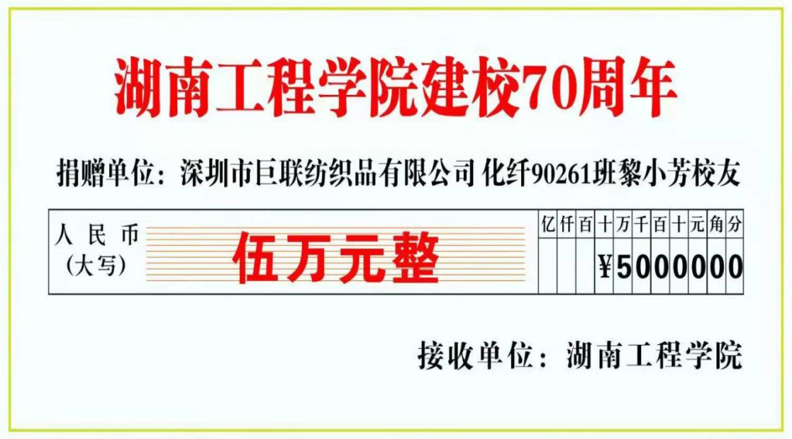 金秋十月,丹桂飘香,在母校迎来七十周年华诞之际,化纤90261班黎小芳校友为母校捐赠五万元,用于伟德betvlctor1946源于英国纺织大楼的建设,助力学校教育事业发展。 黎小芳校友多年来积极支持学校的建设和发展工作,她表示:“分外怀念大学时光,这里教会了她拼搏和奋斗”。在毕业之后,无论身在何方,这些在湖工培养的优良品质都成为了她坚定前行的精神力量。她衷心地祝愿母校桃李满天下,再造七十年佳绩!