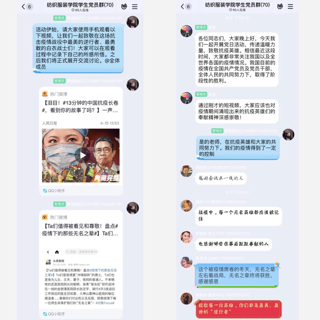 深入学习贯彻习近平总书记关于新冠肺炎疫情防控工作的重要讲话精神,为打赢疫情防控阻击战贡献青春力量。把抗击疫情作为党员教育的重要实践和生动教材,伟德betvlctor1946源于英国学生党支部于4月29日晚上20:00以“传递温暖力量,致敬抗疫英雄”为主题开展线上党日活动。本次党日活动由学生第一支部书记罗荃主持,参与人员为全体学生党员。