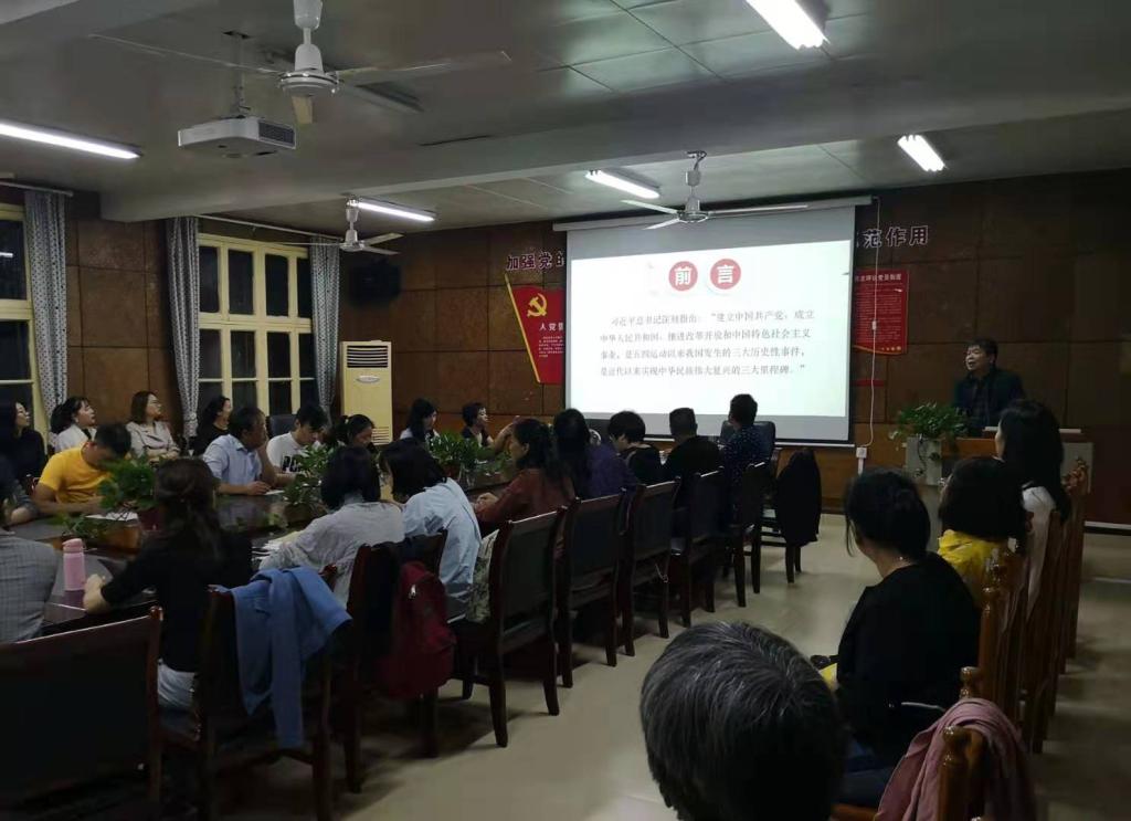 会议首先由学院党总支书记李爱国以"新时代、新中国、新湖南"为基础进行讲解,他谈及新中国新湖南的四个七十年发展的成就与辉煌,中国由建国初期的百废待兴发展到现在的国富民强。现在的新中国经济实力和综合国力大幅跃升,中国已经成为了仅次于美国的第二大经济体。我国经济在全世界经济体中有着不可替代的重要作用。近年来“一带一路”的发展模式不仅带动了各地的地方经济还促进了与世界各国的交流,提升了中国的影响力,中国国际地位空前提高,完成了伟大祖国的站起来、富起来到强起来的历史性跨越,生动彰显了中国共产党领导和中国特色社会主义制度的政治优势。同时李爱国书记指出新中国新湖南70年发展的经验弥足珍贵,我们要吸取前人的经验,不断积累,积极开拓,发展新的时代。最后李爱国书记指出对历史最后的纪念就是要创造新的历史,过去的经验教训也深刻地鞭策着我们,要想不被时光淘汰,唯有努力前行!我们要重整行装再出发,要创新的辉煌!