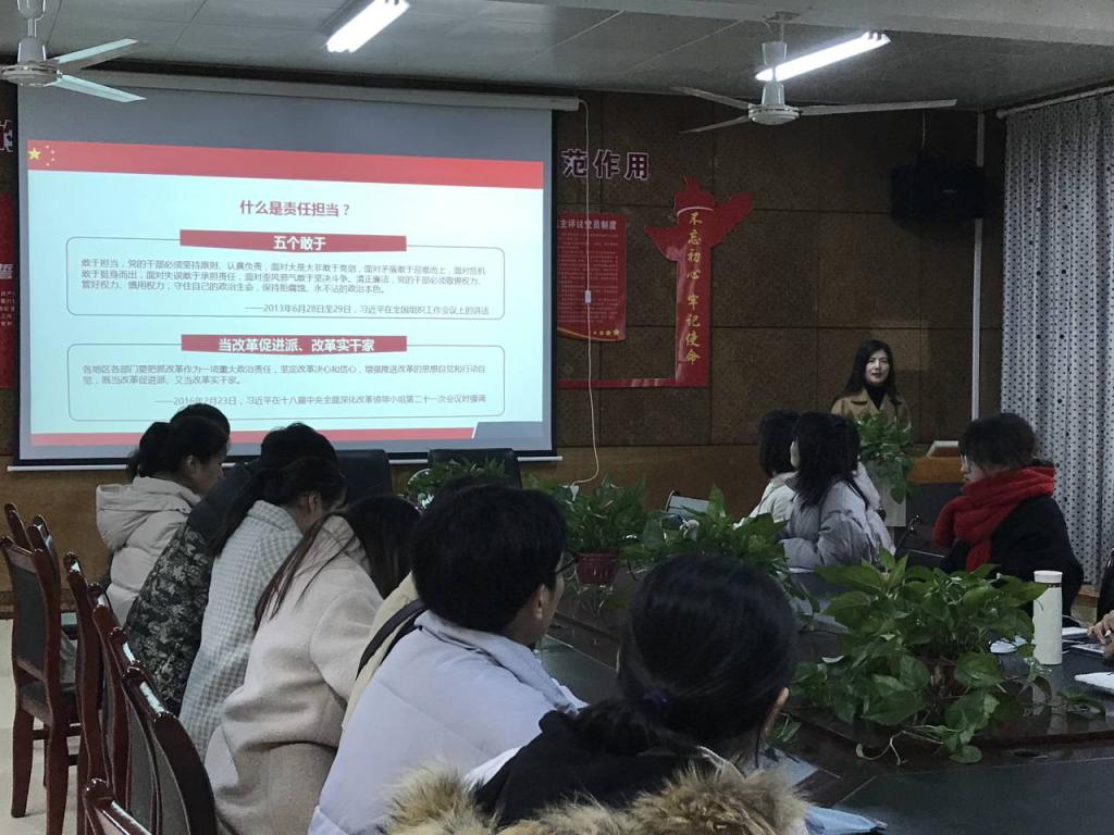 在此次主题学习会上,副书记罗荃从什么是责任担当、为什么要责任担当、和怎么做到责任担当三个方面详细阐述了习近平总书记要求“广大青年,勇于砥砺奋斗,勇做走在时代前列的奋进者、开拓者、奉献者的精神”。作为党员干部,必须一切讲究“实”,做人要踏实,干工作要务实,通过实实在在的努力,抓好工作落实,求真务实,以实际行动,争做“坚定者、奋进者、搏击者”,不做“犹豫者、懈怠者、畏难者”,才能在新时代发挥新作用,到达胜利彼岸。