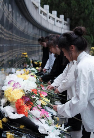 全体青年庄严肃穆,颔首默哀,在学生第二党支部书记傅静琳老师带领下,大家紧握右拳,重温入党誓词,字字铿锵,句句深意。学生党员依次向烈士纪念碑敬献花,致敬峥嵘岁月,遥寄绵绵哀思。