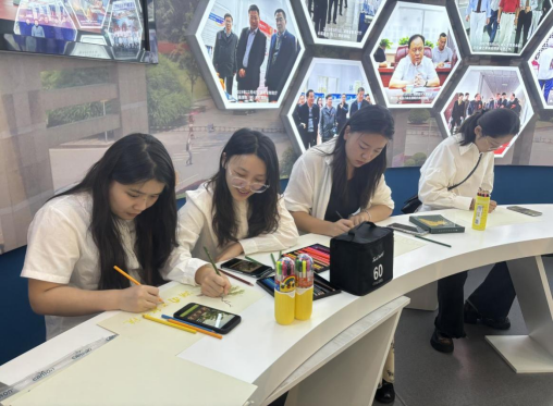 在校史馆学生讲解团的带领下,同学们有序参观校史馆,大家驻足观看学校各个时期的教学成就和历史照片,感受学校厚重的历史底蕴,不时发出赞叹之声。校史馆还特别设置了“寻宝”之旅互动游戏,同学们手持线索卡,在馆内找到隐藏的宝藏进行打卡拍照,并完成绘制校园风景图,现场气氛热烈。