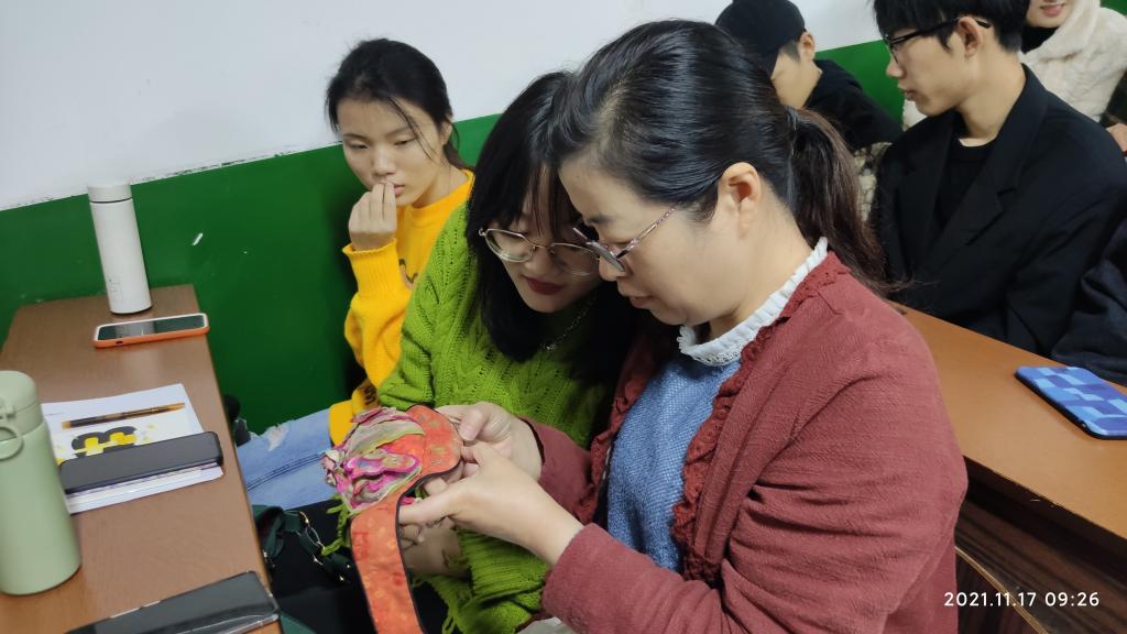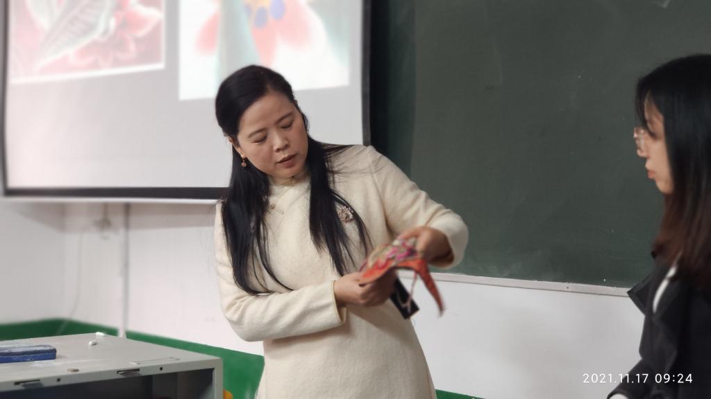 2021年11月17日上午08:30,湖南省非物质文化遗产技艺“桃源刺绣”传承人罗明华女士在北校区4教102为我院18级服设全体学生作题为“桃源刺绣传习与创新”的专题讲座。服装与服饰设计专业教师夏添、杨梅、彭迪、迟晓丽、卿少宁、彭小琴、贺晨亮7位老师出席本次讲座,夏添老师担任本次讲座主持。