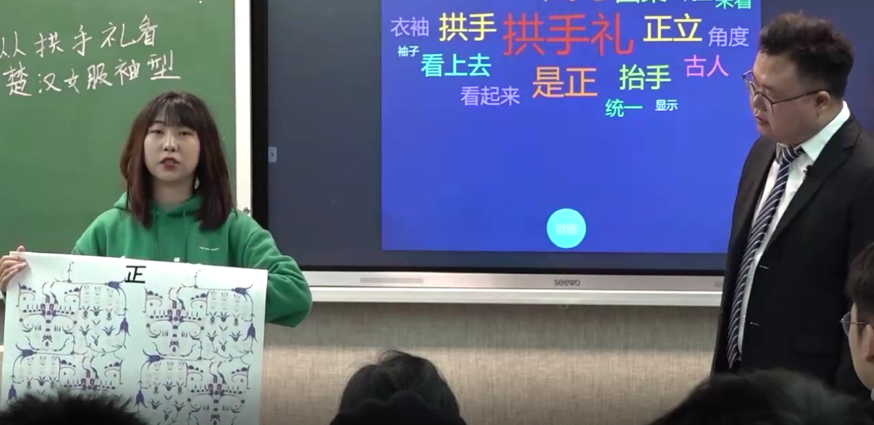 夏添老师在讲授该课程第一章第2节《从拱手礼看楚汉女服袖型》时,把先秦传统礼仪文化、零浪费设计、传统染织刺绣技艺和爱国设计师等思政元素厚植于课程之中,鼓励学生自信、爱学、敬业,以积极主动的人生态度学习和工作,在课程中提升学生的家国情怀、文化素养、道德修养,树立平等包容多元借鉴的思想。