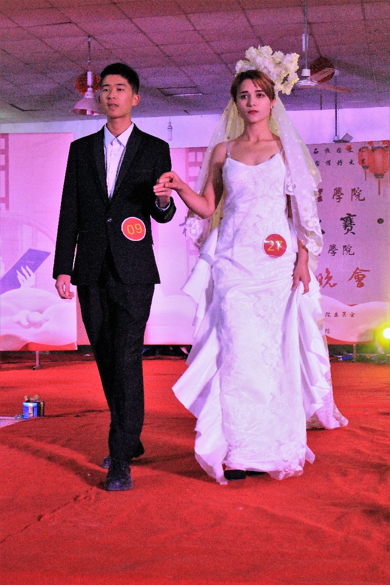 “东湖路128号乐队”的演奏与倾情演唱迎来了模特的第三轮走秀《模特礼服展示》。走秀服装别出心裁,包括婚纱、礼服、西装等成品,全部来自服设1501、1502本学期课程作业,指导老师皮珊珊通过模特的展示为每套服装进行现场点评、打分,并最终评出“最佳设计奖”。