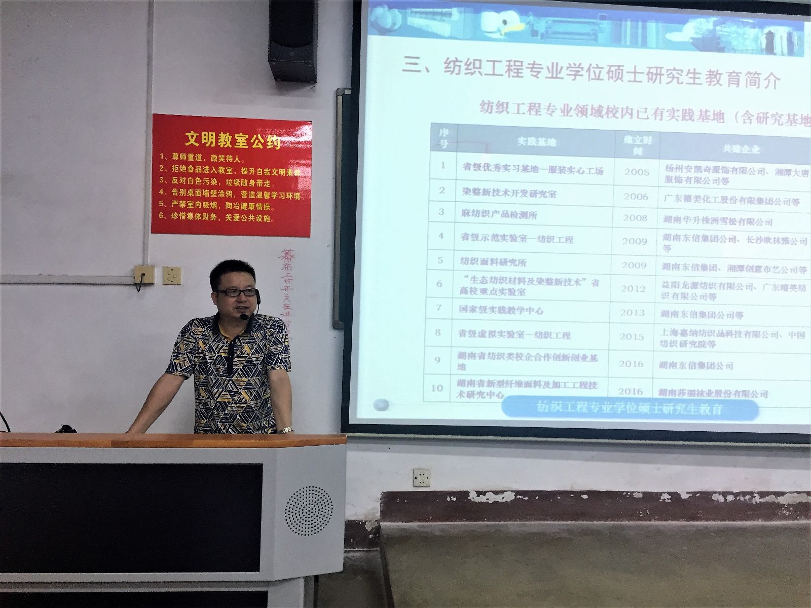 会上,周衡书首先向在座同学介绍了我院的基本概况、学科建设、科研成果以及研究生奖助政策。强调伟德国际victor1946是湖南省唯一开展纺织工程的学校,他通过介绍伟德betvlctor1946源于英国的考研优势,向同学们分析了报考伟德betvlctor1946源于英国研究生的难易程度,为在场考研的同学报考院校又增加了一条有利选择。随后,周衡书指出:“在社会不断发展的今天,纺织产业改造升级需要大量高层次工程应用型人才”。他要求同学们在提高了自身能力的基础上也要满足社会服务需求。接着他向大家介绍关于纺织工程专业学位硕士伟德国际和纺织工程专业领域校内已有实践基地。纺织工程专业拥有优秀的就业发展前景,同学们不仅可以通过考研多种选择来增加就业的机会,而且学校将成选拔品学兼优得硕士毕业生留校工作 。