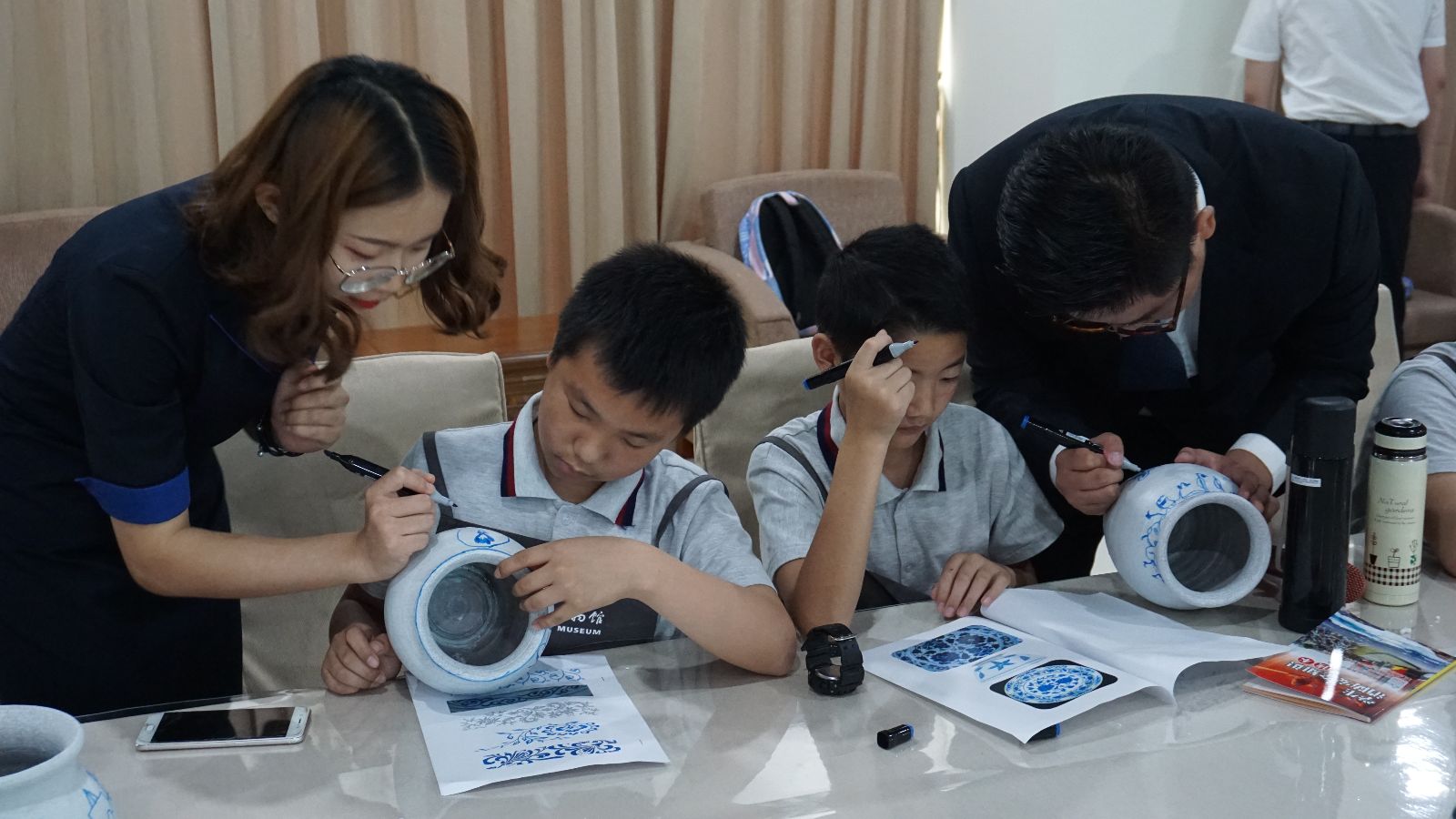 最后,我校志愿者利用他们的专业优势,对现场参与青花瓷绘制活动进行指导,手工引导孩子们素胎勾勒青花瓷,趣味讲解湖湘文化、湘潭博物馆历史知识及消防安全知识等。
