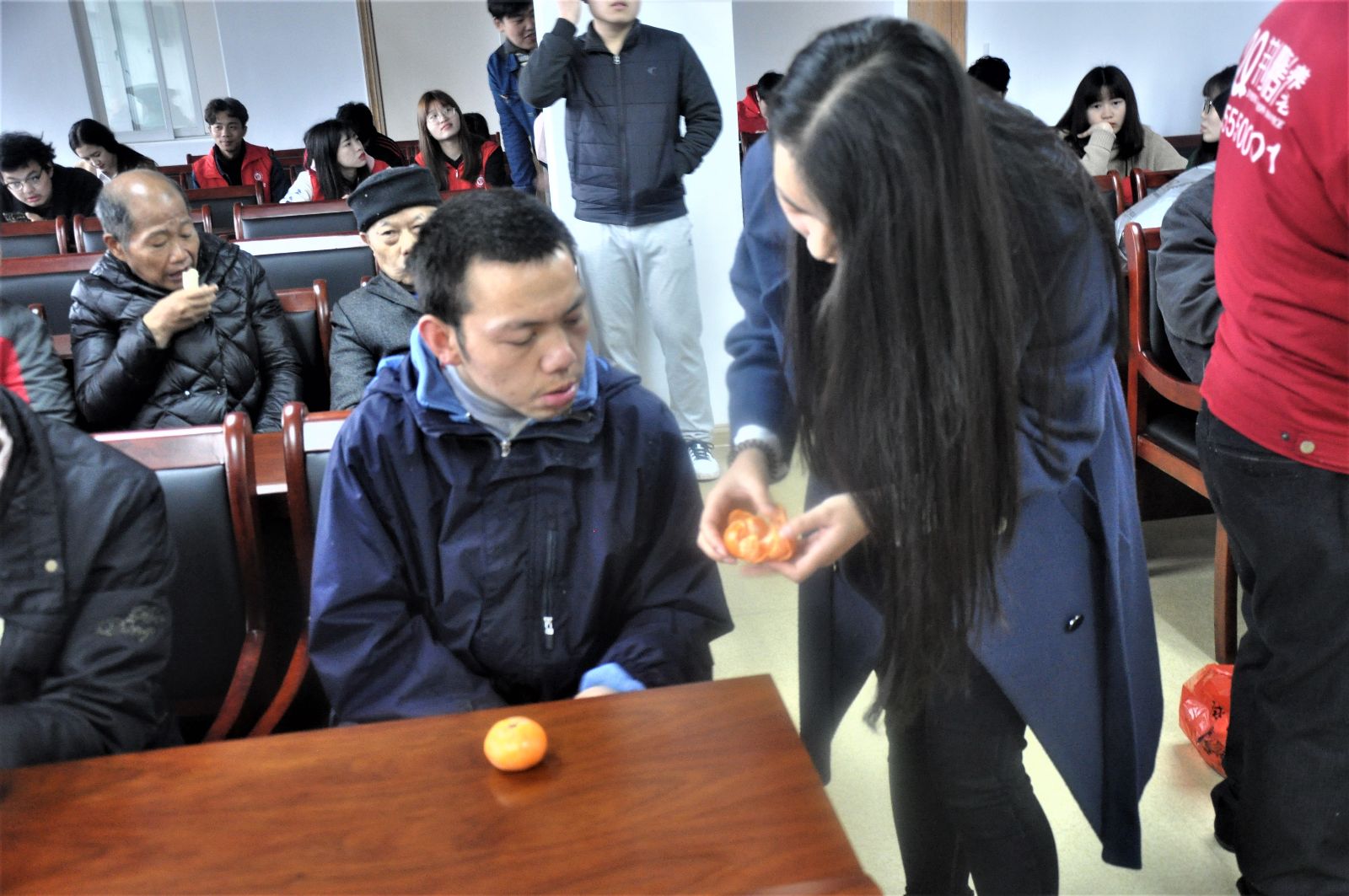 福利院内,志愿者们首先看望了一群特殊的人,他们或被家人遗弃,或智力存在缺陷,简单的表演都能让他们开怀大笑,脸上溢满幸福的笑容。志愿者们真诚且耐心地和他们沟通,陪他们游戏,为他们表演舞蹈、唱歌、朗诵和小品等节目,并为他们送去慰问品。