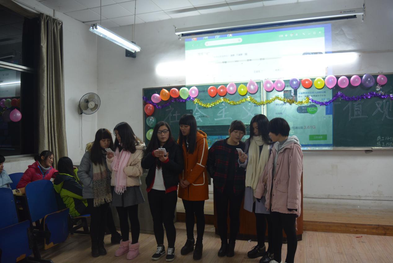 活动开始,主持人为大家详细讲解了社会主义核心价值体系的深刻内涵,阐明了社会主义核心价值体系的重要意义。同时,就如何学习、践行社会主义核心价值观进行了深入细致的剖析与讲解,并要求全体学生时刻牢记社会主义核心价值观“富强、民主、文明、和谐、自由、平等、公正、法制、爱国、敬业、诚信、友善”24字基本内容,在学习生活工作中真正起到先锋模范作用。同时,同学们就学习社会主义核心价值观这一主题作发言,表达自身树立远大的理想信念,坚定社会主义道路,努力学习科学文化知识,立志成才的决心。并踊跃参与“抱团凑钱”和“萝卜蹲”等互动活动,合唱“我的未来不是梦”,抒发他们的青春豪情。
