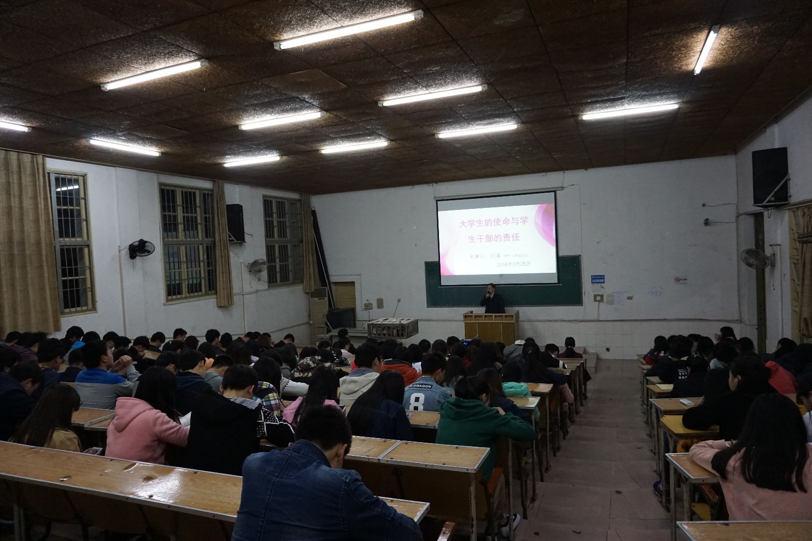 讲座以“大学生的使命与学生干部的责任”为题,深刻阐述了学生干部在学习、自信心和创新三方面的使命与责任。刘涛处长强调,作为团学干部,除了学好专业知识,更要学会用理论武装自己,用成人文化的心理思考问题、解决问题,实现团学工作的规范化和制度化。知识比不上智慧,智慧比不上经验,刘涛处长进一步指出,身为团学干部就要学会创新,懂得在上一届团学会的基础上有所突破,以更加新颖和独特的方式加强对团员青年的思想政治教育和团干部的业务培训,提高工作效率,加大宣传力度,扩大团总支学生会的影响。整场讲座生动形象,刘涛处长以一系列名人的事例,一一为青年学生干部讲述了如何学习、树立自信、实现创新,传递青春正能量。最后,讲座在一阵阵热烈的掌声中结束。